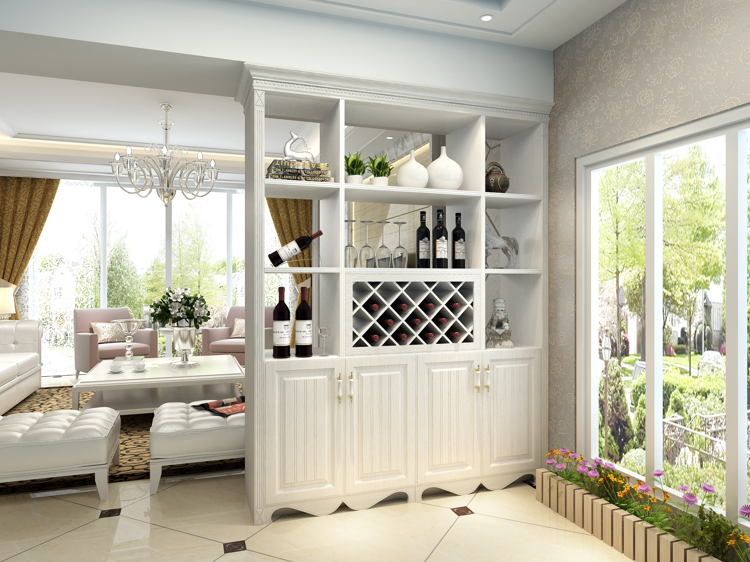 这款浑身散发着浪漫气息的客厅装修酒柜,选用白色苏香桐板材定制,上虚下实的规划体现出规划的美感。美丽的线条,高雅的气质,能够藏酒又可储物;一起还兼具间隔和打扮润饰的效果,也为空间增加了一丝田园风情。