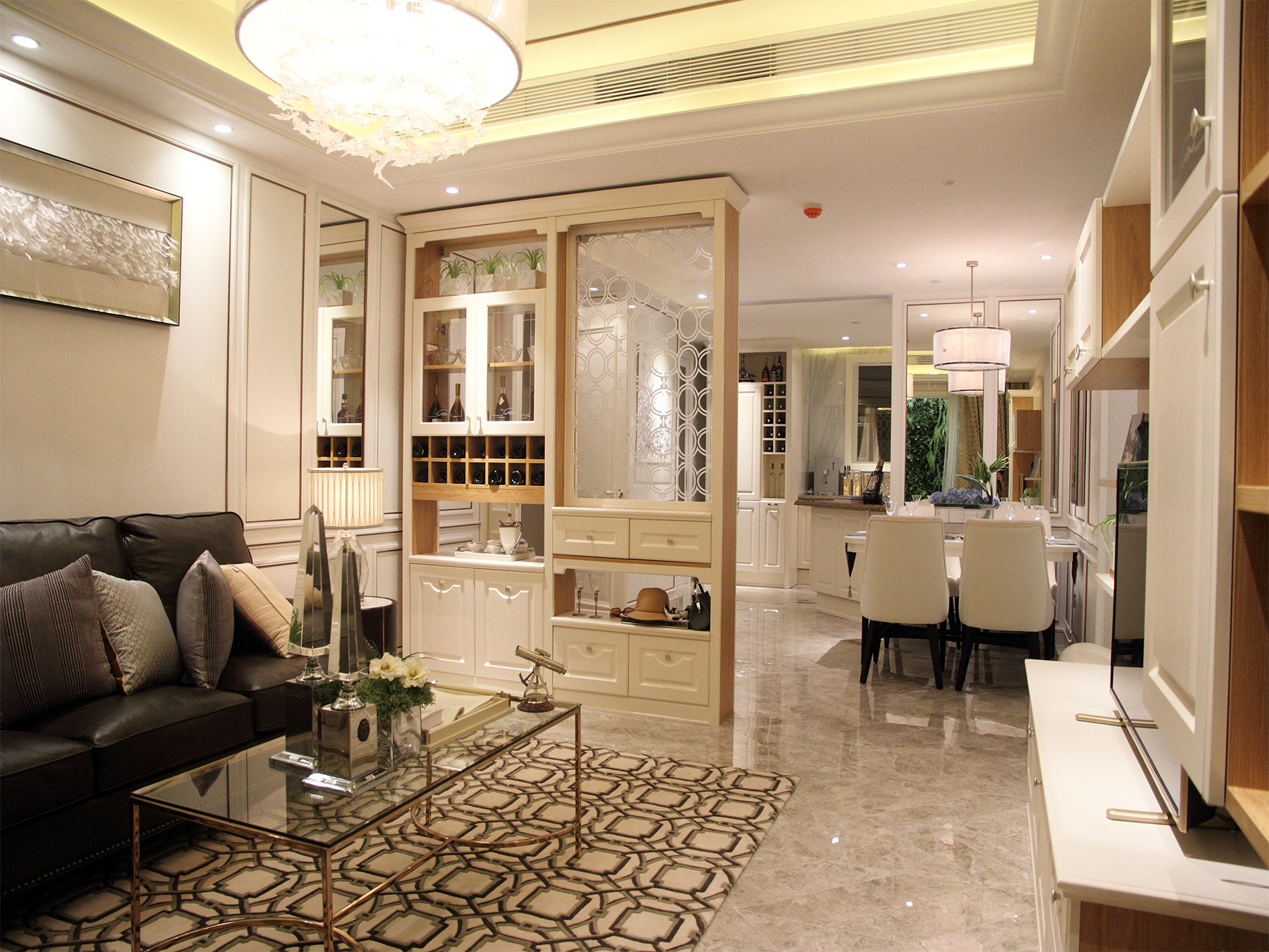 在客厅与餐厅之间,装修酒柜就犹如一道屏风将客餐厅间隔,其共同的规划为家居增加几分美感。凹凸参差的柜体,便利藏酒和储物;玻璃的参加更是带来通透之感,体现出家居隔而不断之美。